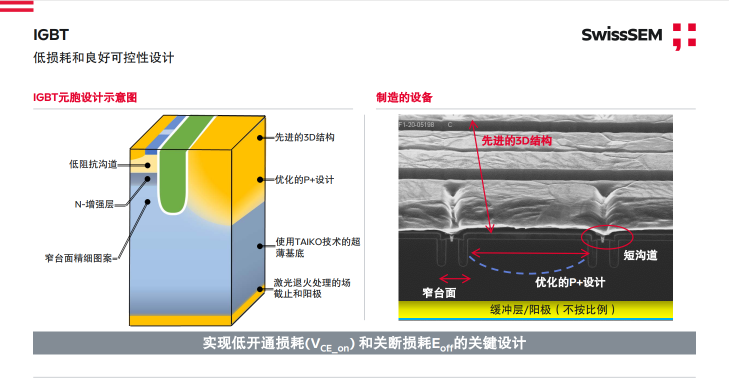 i20 IGBT芯片,采用FS-TRENCH结构、多项国际前沿优化设计,具有低阻抗短沟道、先进的3D结构、N-增强层,使用TAIKO技术超薄基底、优化的P+设计,以及窄台面精细图案、激光退火处理的场截止层和阳极等优势,多项国际前沿优化设计带来超低导通损耗和关断损耗。