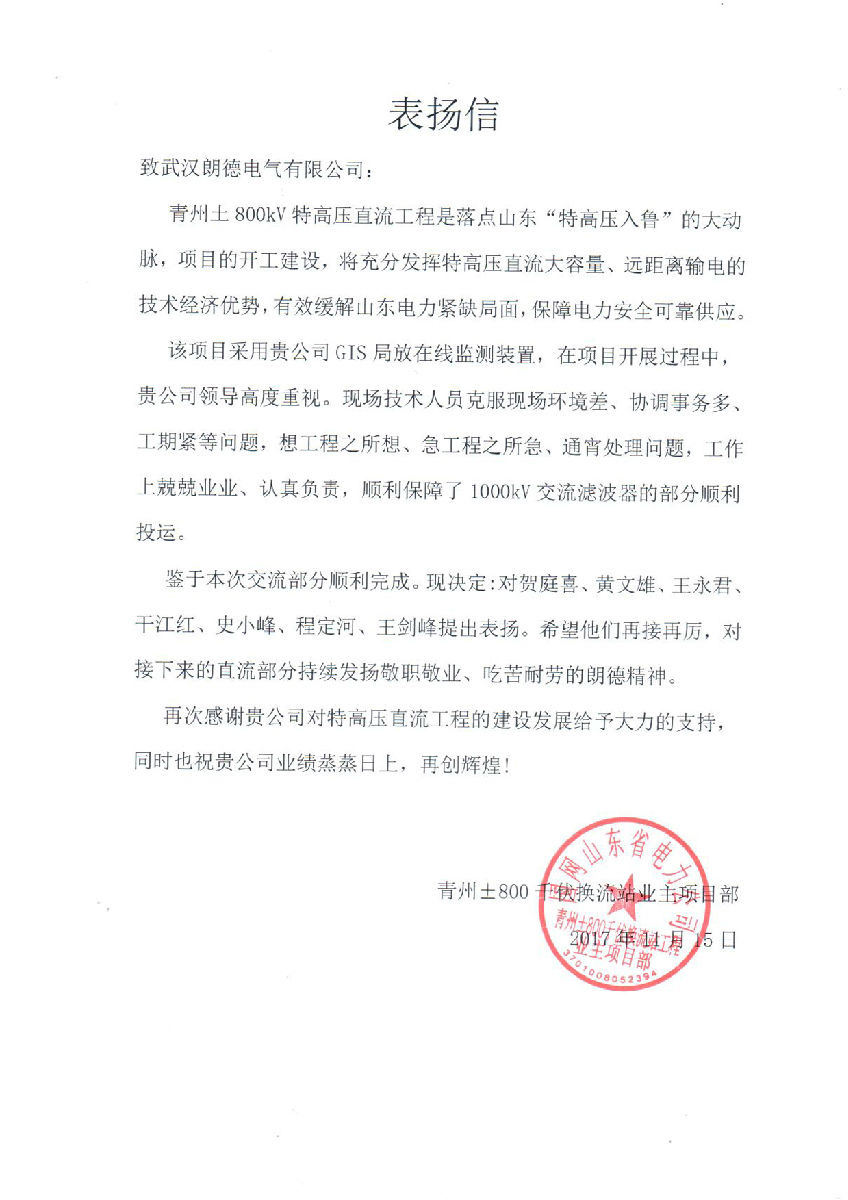 赛晶集团下属子公司——武汉朗德电气有限公司的GIS局放在线监测装置,于2018年1月1日在±800kV特高压直流输电“扎鲁特-青州”工程顺利投运。
