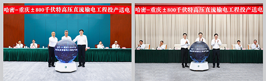 6月10日,国家电网有限公司哈密—重庆±800千伏特高压直流输电工程投产送电。新疆维吾尔自治区党委书记马兴瑞,重庆市委书记袁家军,新疆维吾尔自治区党委副书记、自治区主席艾尔肯·吐尼亚孜,重庆市委副书记、市长胡衡华,国家电网公司董事长、党组书记张智刚,公司总经理、党组副书记庞骁刚出席工程投产送电。新疆维吾尔自治区党委常委、自治区常务副主席陈伟俊,自治区党委常委、秘书长哈丹·卡宾,自治区政协副主席、自治区国资委党委书记金之镇在新疆,重庆市委常委、常务副市长陈新武,市委常委、秘书长刘尚进在重庆出席。国家电网公司副总经理、党组成员潘敬东主持。工程投产送电前,马兴瑞会见张智刚一行。