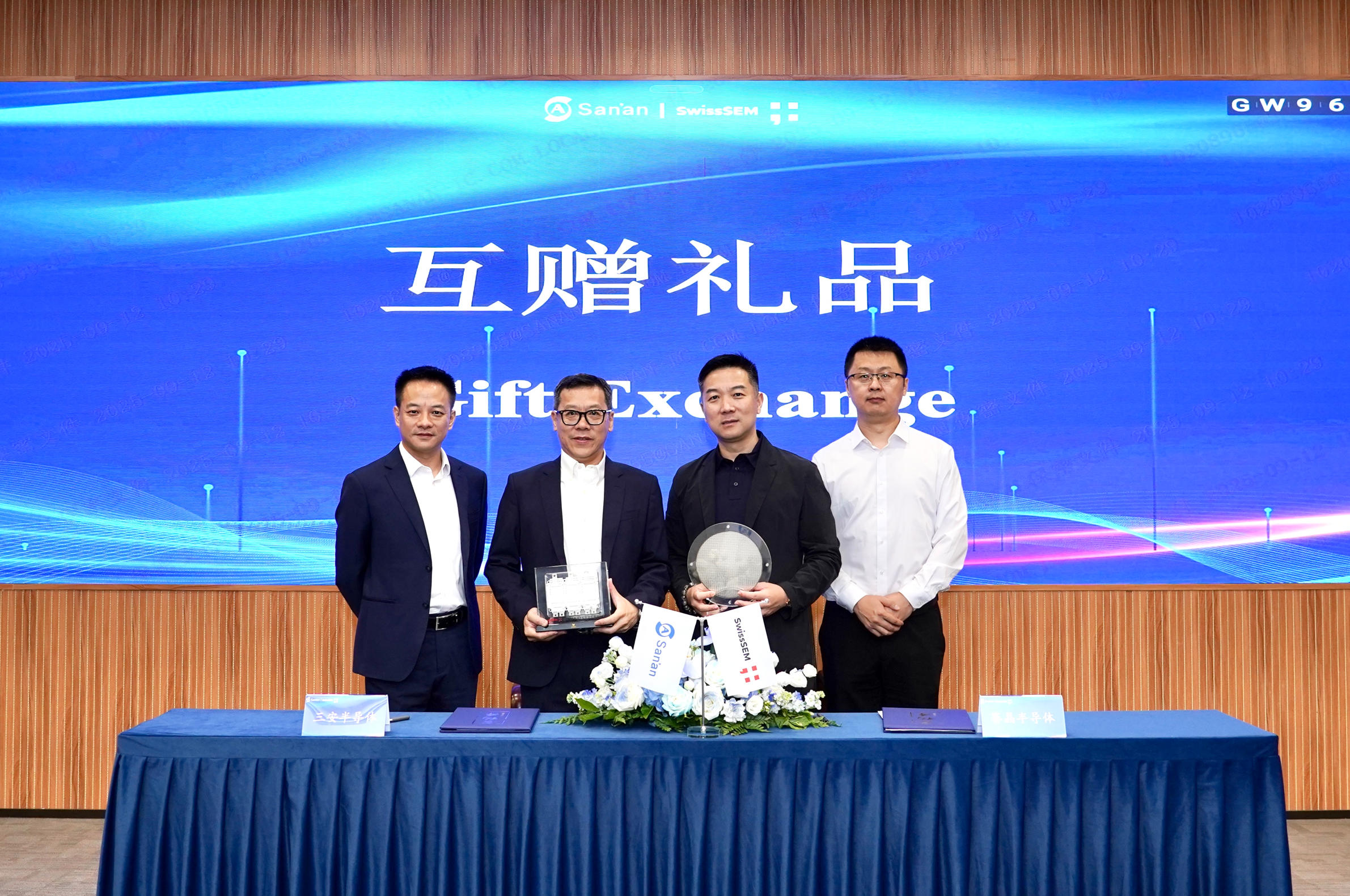 随后,赛晶半导体联席CEO张强先生与湖南三安副总经理张真榕先生正式签署战略合作协议,项颉先生与江协龙先生共同见证这一重要时刻。随着双方互赠纪念品,标志着合作进入全方位推进的新阶段。